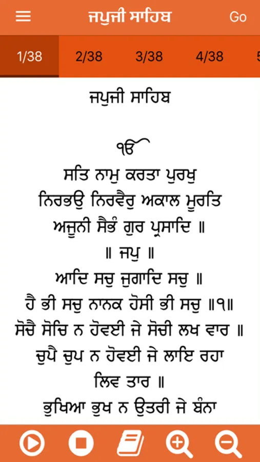Japji Sahib is a Sikh prayer, that appears at the beginning of the holy scripture of the Sikhs, the living Guru, Guru Granth Sahib. It was composed by Guru Nanak Dev, the founder of Sikhism. It is headed by Mool Mantra and followed by 38 paudis (stanzas) and completed with a final Salok at the end of this composition.