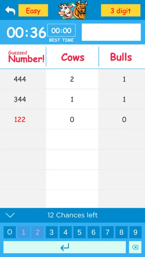 For example, if the secret number is 1234, and the first guessed number is 5678 would result in "0 Cows, 0 Bulls" (since all the guessed digits are not in the secret number). If the guessed number is 4567 it would result in "1 Cows, 0 Bulls" (since 4 is present, but not in the exact position), and if the guessed number is 8214 it would result in "1 Cows, 2 Bulls" (since 2 and 4 are in the right positions, while 1 is in the wrong position). The game would continue until you guess the right number with "4 Bulls".