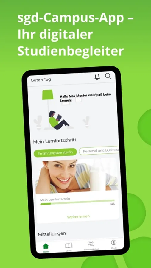 Mit der sgd-Campus-App haben Sie den perfekten digitalen Studienbegleiter: Greifen Sie mobil mit Ihrem Smartphone von überall auf Kursinhalte, Campus-Mails, Notenansicht und vieles mehr zu. Laden Sie Ihre Studienhefte herunter und lernen Sie mobil, wann und wo Sie wollen.