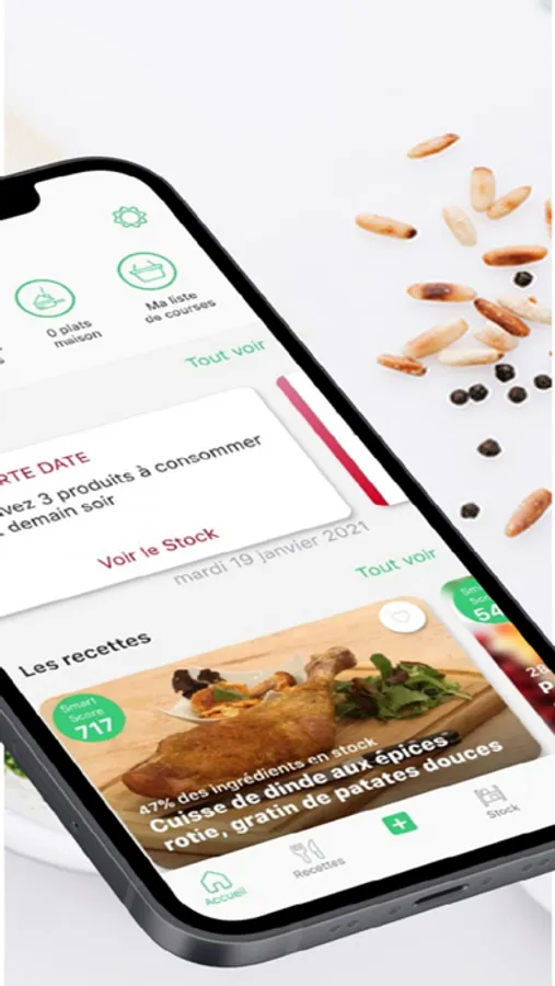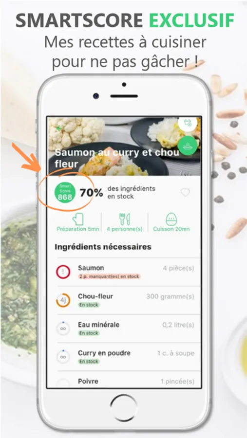 • Découvrez chaque jour des idées de recettes en fonction de ce que vous avez en stock et retrouvez le plaisir de savoir ce que vous allez manger aujourd’hui. Grâce au SmartScore exclusif Weasyn, vous savez immédiatement les recettes qui vous permettent de ne pas gaspiller. Plus l’indice est élevé, plus c’est la recette adaptée ! Elles sont personnalisées et classées en fonction des aliments que vous avez en stock, des dates de consommation les plus proches et du nombre de convives. Cela n’a jamais été aussi simple de se régaler et de ne pas gâcher !