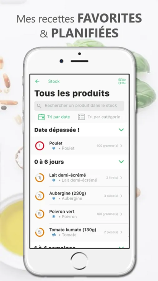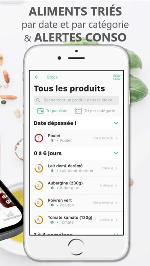 • Visualisez vos aliments par catégorie et par date de consommation : en un coup d’œil, vous savez ce que vous avez et ce qu’il faut manger en priorité. Des notifications pour les produits à manger rapidement et ainsi éviter le gâchis