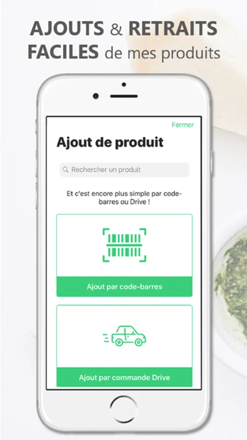 • Enregistrez facilement vos produits, soit par scan de codes-barres, soit par transfert de commandes Drive (selon compatibilité avec les enseignes et services de messagerie), soit très simplement par saisie manuelle.