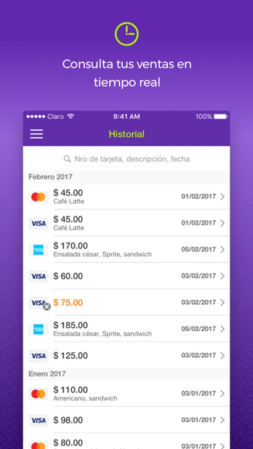 Detalle completo de todas tus ventas realizadas, con la posibilidad de buscar por fecha, vendedor, artículo vendido y tarjeta utilizada, entre otras opciones.