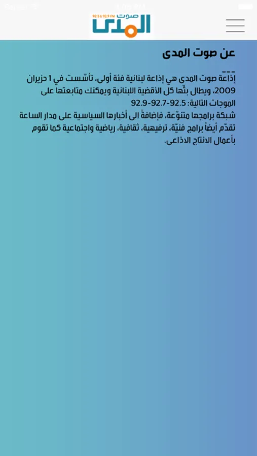 إذاعة صوت المدى هي إذاعة لبنانية فئة أولى، تأسّست في 1 حزيران 2009، ويطال بثّها كل الأقضية اللبنانية ويمكنك متابعتها على الموجات التالية: 92.5-92.7-92.9