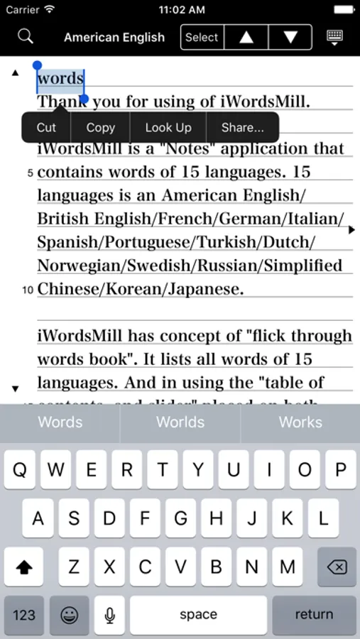 In addition, since words list of iWordsMill contains most entry words (more than 99%) of the offline dictionaries of iOS, Look up the definition of words from the "Notes" menu bar You can.