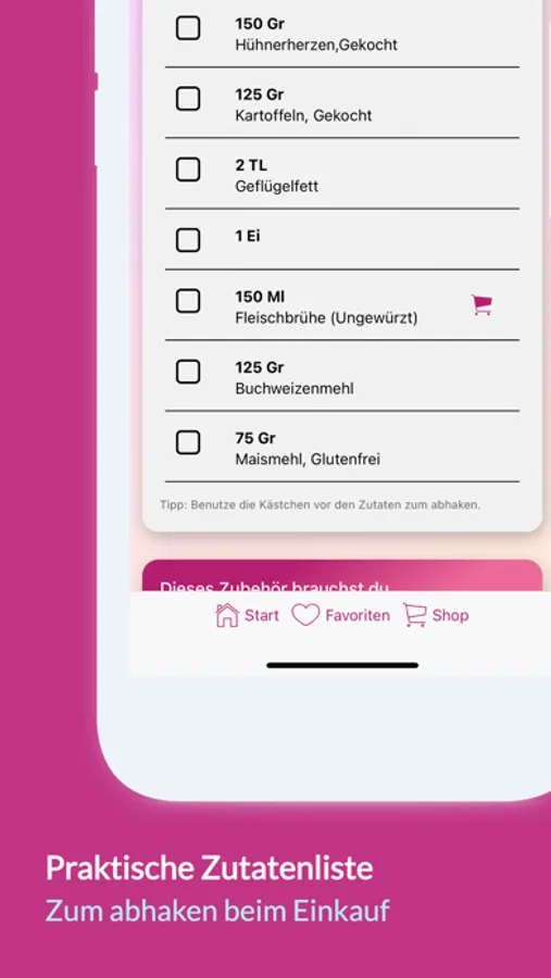* Checklisten-Funktion für Zubehör und Zutaten zum einfachen abhaken und Einkaufen