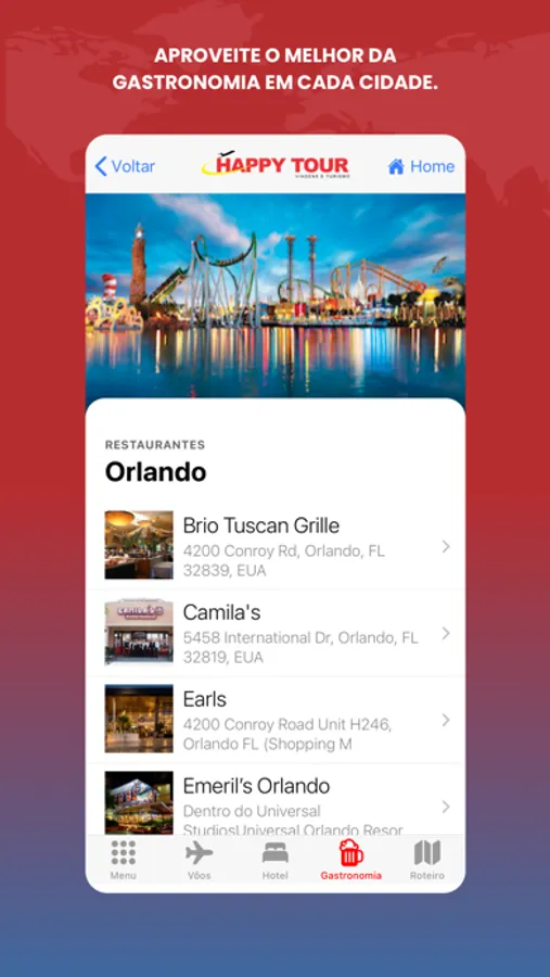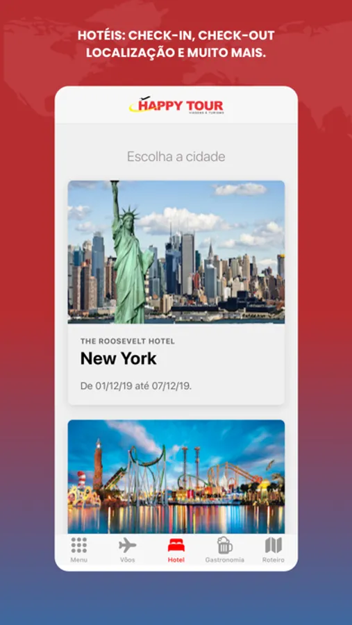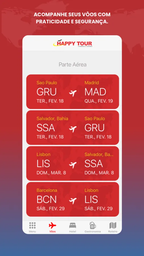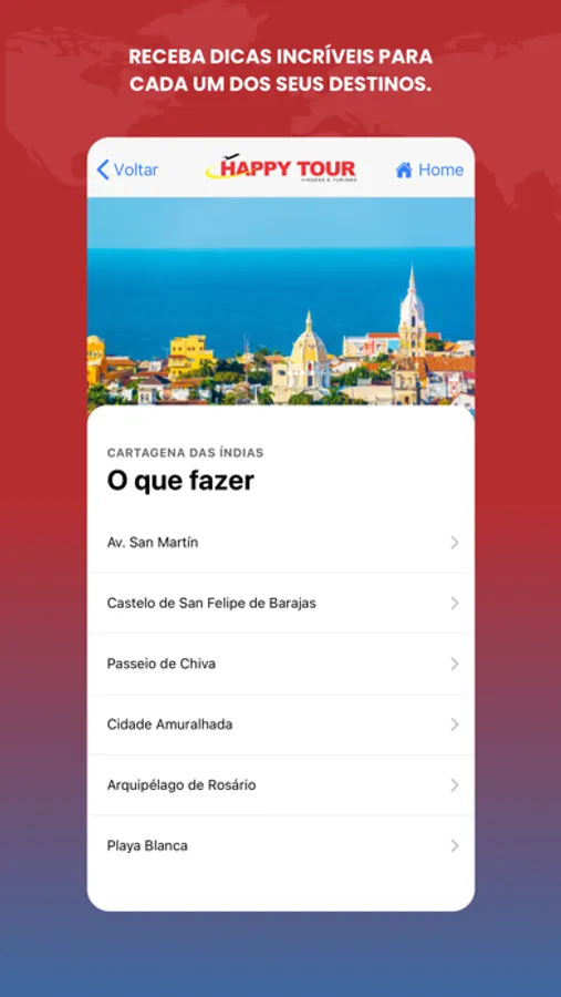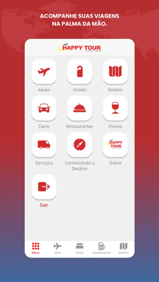 O aplicativo Happy Tour é um guia de viagem de bolso. Acesse facilmente o roteiro de sua viagem através do código fornecido pelo seu agente, sem necessidade de cadastro, com agilidade e segurança. Através do app é possível verificar vôos, hotéis, restaurantes e vinhos, roteiro de viagem, dicas de destinos, serviços, translado, navios, seguro de viagem e muito mais. Todas as informações que você precisa para viajar com tranquilidade.