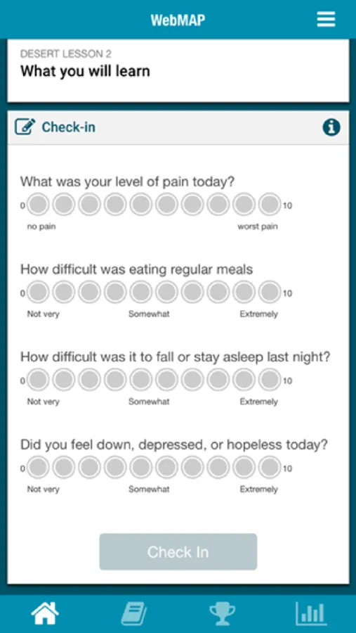 In this program, you will learn different behavioral and cognitive skills for managing pain and for doing more activities that you want to do. You are going to be traveling through awesome destinations during the program. It takes about 6 weeks or so to go through all of the destinations; however, you can use this app and the skills recommended for as long as you need to. Each of the places that you visit will teach different skills to help you manage your pain. You will also keep track of your symptoms and progress, and complete assignments to help you practice new skills. You will work on each assignment for a few days before you move onto the next place.