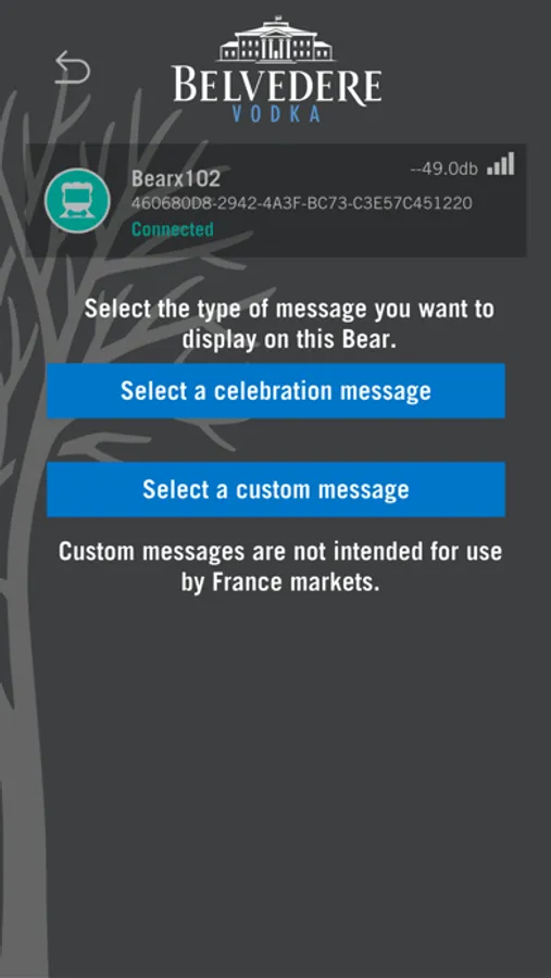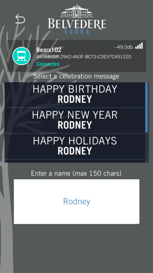 The BelvedereDigi app has been created for use with the 1.75 & 3L Belvedere DigiBear. The app offers Bluetooth connection to the bear, allowing participating venues to write a special customized message for patrons that will be digitally transferred to the bear’s video screen. This app provides club-goers with an exciting, unique and personalized experience.