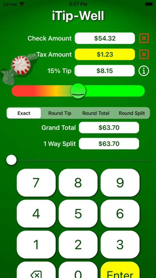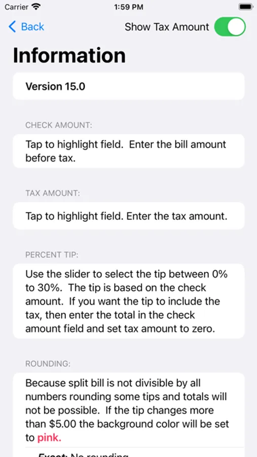 Tip calculator. Select tip value between 0% and 30%. The calculation can be rounded to the nearest dollar. The calculation can also be split between 1 to 30 people.