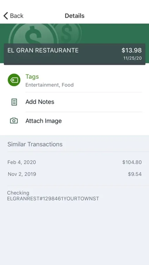 Add Tags, Notes, Images & Geo-Information: By enhancing transactions with custom tags, notes or photos of a receipt or check, you have the ability to stay organized and find exactly what you’re looking for when searching through your finances.