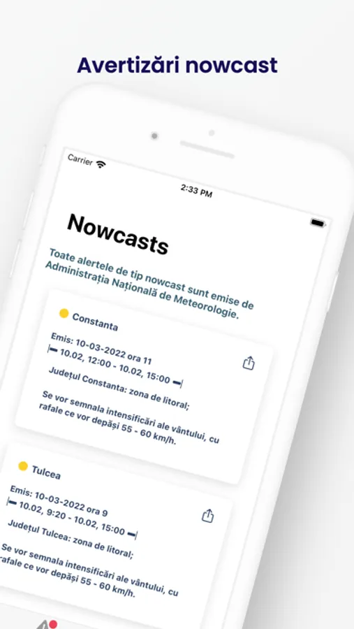 Toate avertizările sunt preluate cu o întârziere minimă de la sursa care le publică și sunt trimise imediat sub formă de notificări* și email** pentru utilizatorii care au județele setate pentru notificări. În versiunea actuală a aplicației, avertizările nowcast (denumite alerte nowcast) vin de la MeteoRomania. Avertizările și informările generale (denumite avertizări generale) vin de la EUMETNET. Informările meteorologice care nu includ avertizări și județe în text vin de la MeteoRomania.