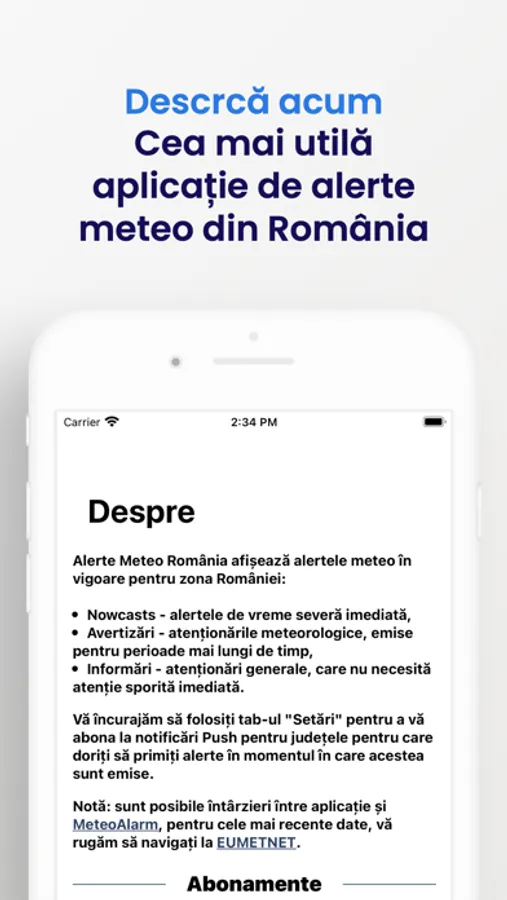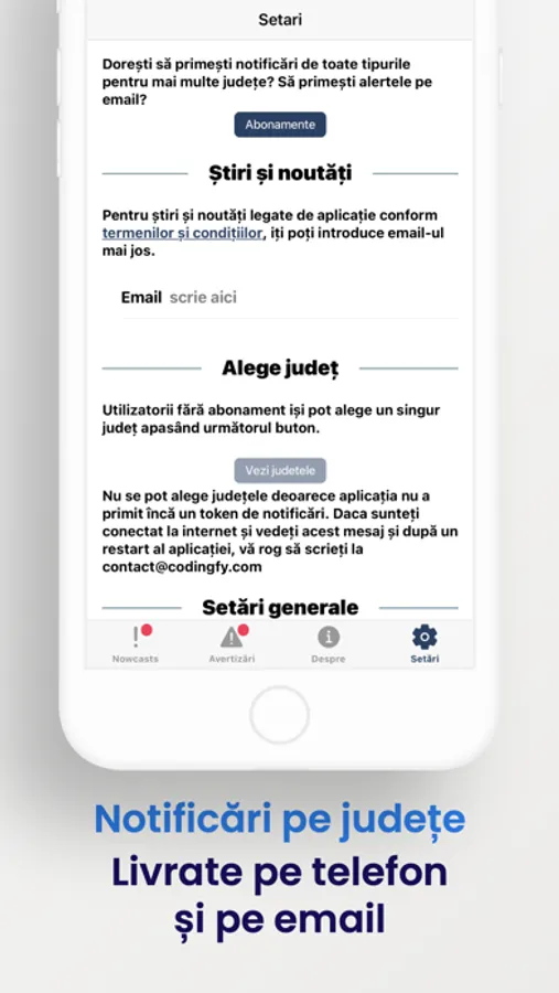 *fără abonament, beneficiați de notificări nowcast nelimitate pentru un singur județ. Este necesar un abonament pentru notificări de la mai multe județe și pentru celelalte tipuri de avertizări si informări.