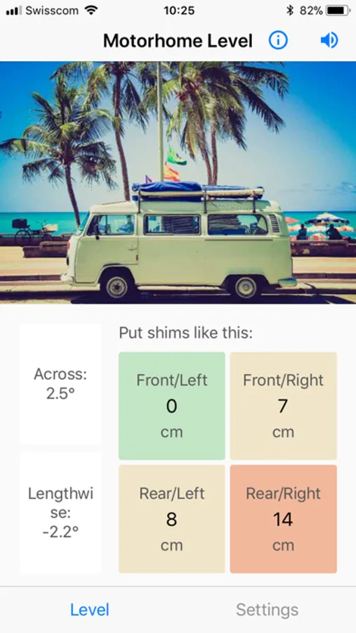 You are in the 21st century and you have all the rights to impress your pitch neighbor. With "Motorhome Level" you know instantly how high the blocks have to be for every wheel. In a sweep you're done and the relaxation begins!