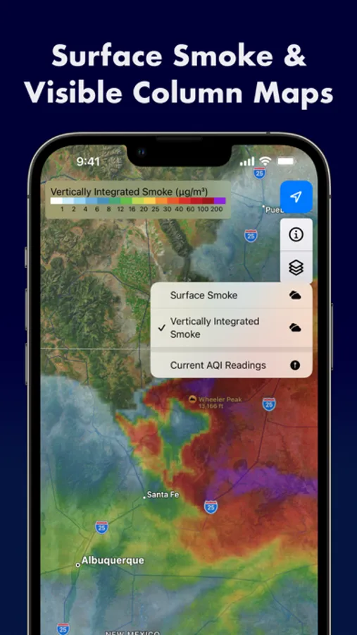 Air Quality Index displays 48 hour Near Surface and Vertically Integrated Smoke prediction maps using data provided by NOAA's National Centers for Environmental Prediction. Forecast maps are available for the Continental United States. The maps also optionally display AQI readings from the EPA's AirNow data service.
