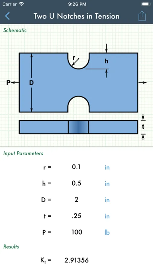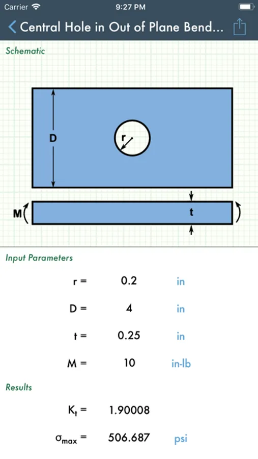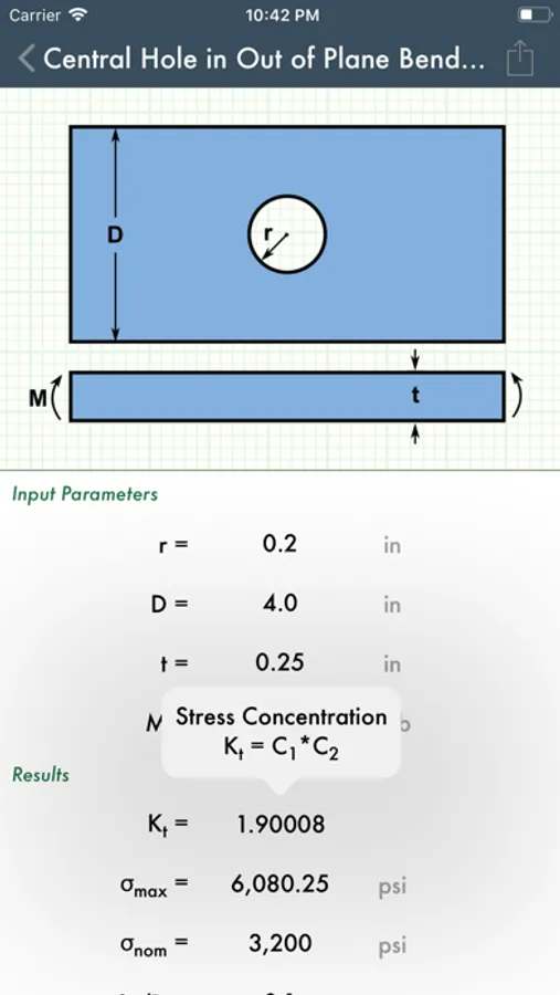 Sometimes simple stress formulae are not enough. The real peak stresses in hardware occurs at geometric discontinuities such as notches, holes, & filets. To get an accurate stress value, you need a stress concentration factor. This app makes that easy. Along with stress concentration factors, this app calculates the nominal and peak stresses, displays the equations, & easily prints or shares via email your result with a couple of taps.