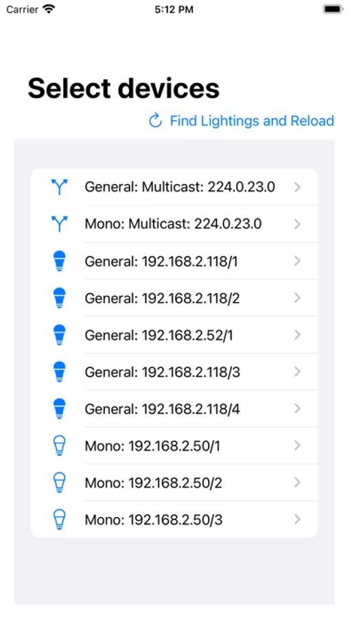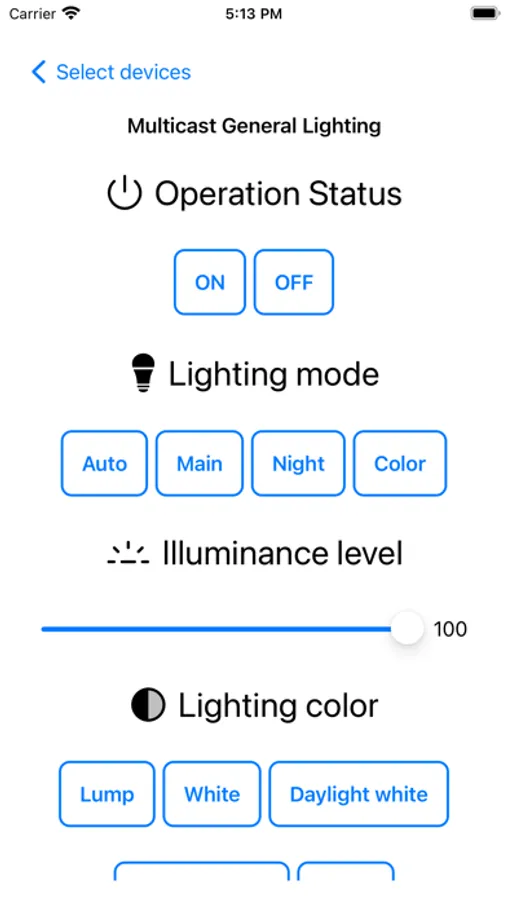This app is lighting controller with ECHONET Lite protocol over LAN. The app can change properties which are On/Off, Mode, Illumination Level, Color Type, and RGB.