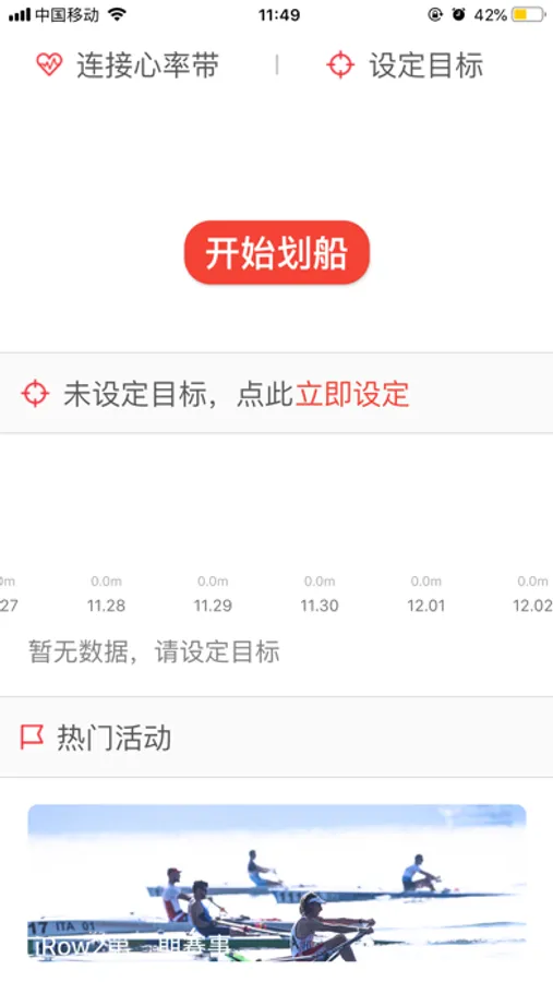 主要是热门活动、赛事(健身房模式及好友约赛)、划船、训练模式、我的 五个主要页面 。用户可以在热门活动参加官方发布的活动,在赛事里面查看自己赛事 和新增赛事。划船界面如果搜索到对应的蓝牙设备,可以进行连接蓝牙,通过软件查看和记录自己的运动数据。训练模式中根据官方发布的初、中、高不同级别的运动方式进行针对式训练, 我的界面是用户相关信息界面。