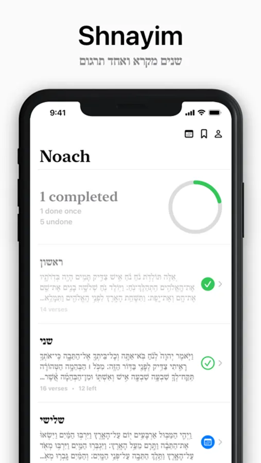 Welcome to a whole new way to complete shnayim mikrah vechad targum. Halacha dictates to read the week’s parshah twice and its targum, translation, once. Sometimes it can be difficult to keep track and quite easy to lose your place. Let Shnayim solve all your issues by helping you track your progress, save specific verses, add notes and more all in a simple, easy to use and beautiful interface.
