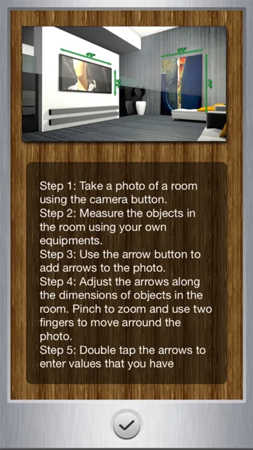 This app lets you take a photo and add measures data into it. You can then save the photo with measurements data for later use. You can also send the photo to the customers or coworkers.