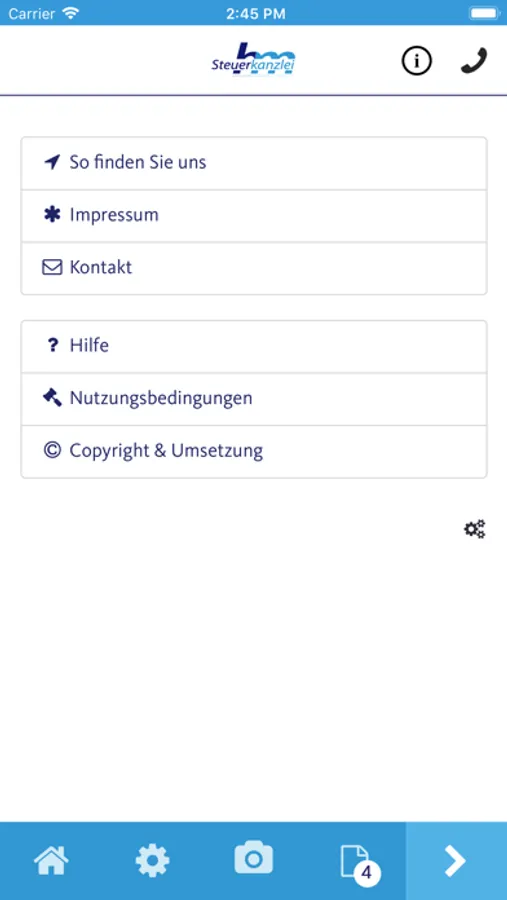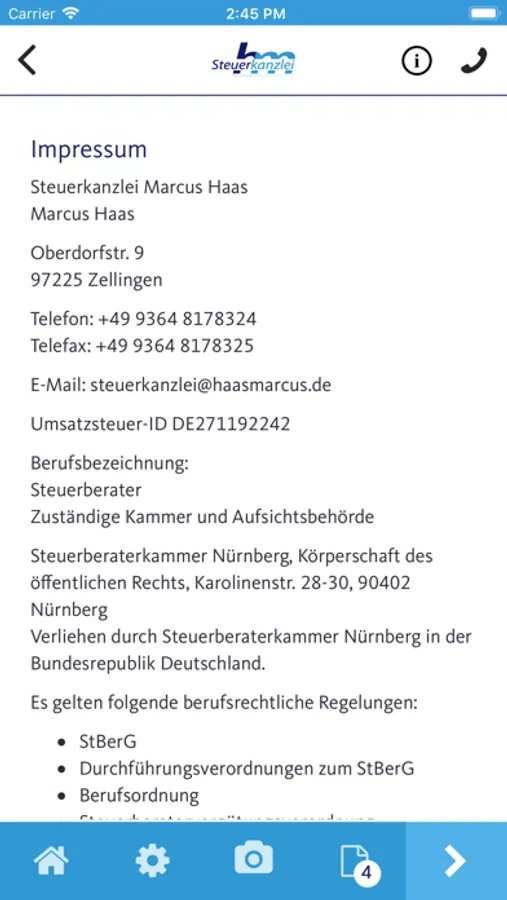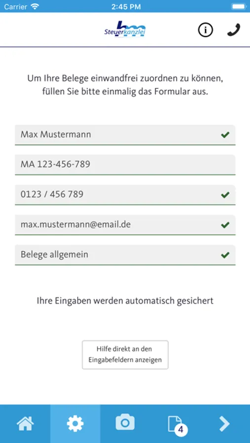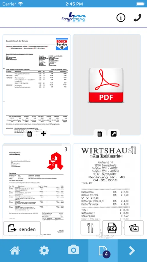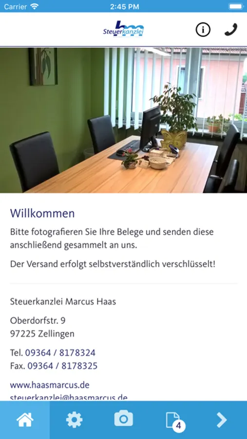Mithilfe dieser App können Belege, Dokumente, und andere Schriftstücke schnell, sicher und komfortabel an uns geschickt werden. Machen Sie einfach ein oder mehrere Fotos von Ihren Belegen und versenden Sie diese mit einem Klick direkt aus der App heraus an die Steuerkanzlei Marcus Haas.