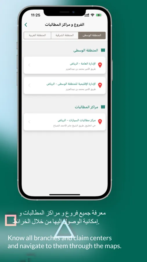 معرفة جميع فروع و مراكز المطالبات و إمكانية الوصول اليها من خلال الخرائط.