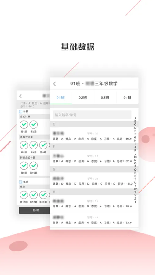 教师查阅评测结果数据:包括各班学生总分、等第、卷面逐题逐板块的答题情况的数据。