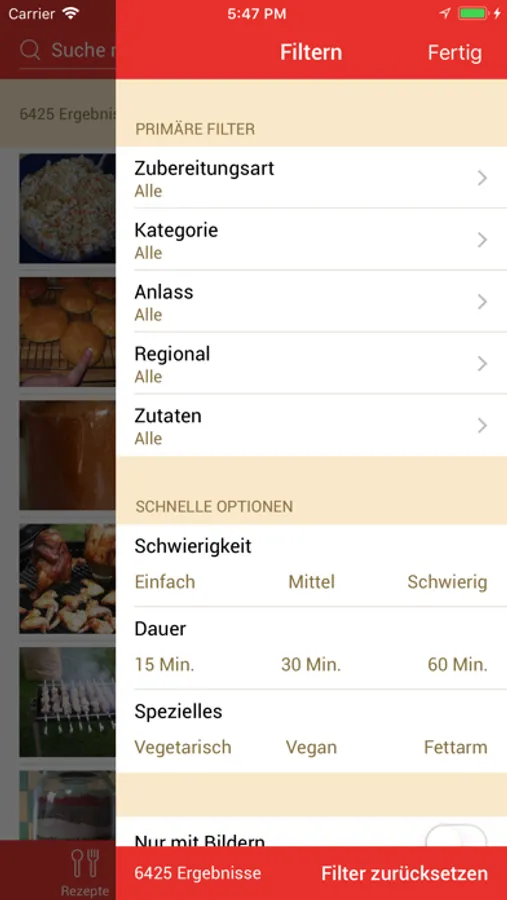 - Filterung der Rezepte nach Zubereitungsart, Kategorie, Anlass, Region und Zutaten sowie weitere Optionen.