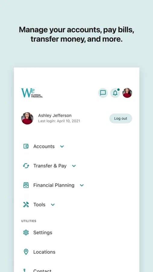 Stay connected to your money with the We Florida Financial mobile app. View your account balances, check your transaction history, transfer money between accounts, pay bills, deposit checks (mobile deposit access is subject to approval), pay your We Florida Financial loan, locate nearby branches, and track your personal budget and savings goals. See our Terms & Conditions Agreement for information on crediting of deposits. Funds availability is subject to We Florida Financial’s Funds Availability Disclosure. Federally insured by NCUA. Equal Housing Opportunity.