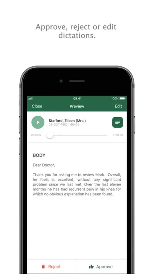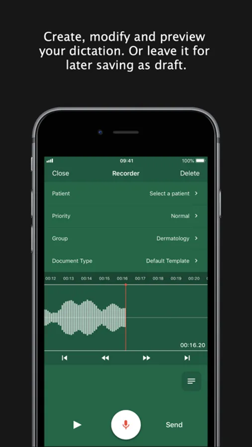 The CG Dictate by T-Pro iOS app allows users to create dictations on the go, and securely send them the the T-Pro platform for processing. Uploaded dictations can be tracked as they are processed by transcription teams or T-Pro's back-end speech recognition servers.