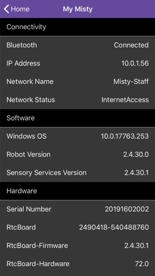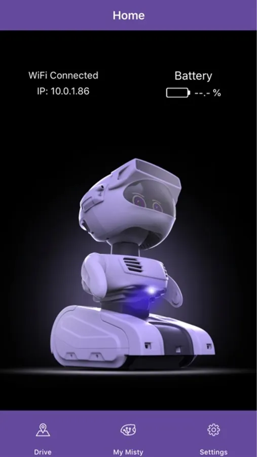 Misty’s Companion App lets you set up Bluetooth and Wi-Fi connections to your robot and drive Misty around her environment. The app also provides a clean interface for getting information about your robot’s battery levels, software versions, and IP address.