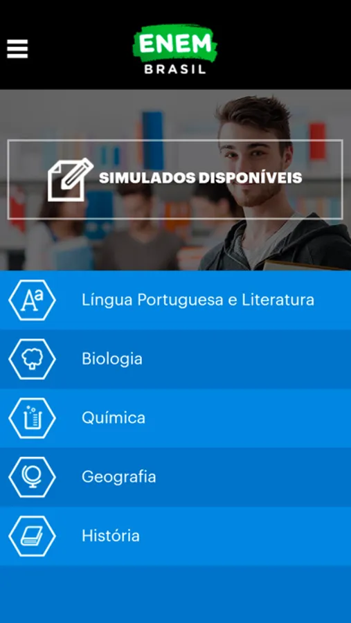 Nele o aluno encontra questões de todos os níveis de dificuldade, separados pelas matérias: Literatura e Língua Portuguesa, Física, Química, Biologia, História, Geografia e Matemática.