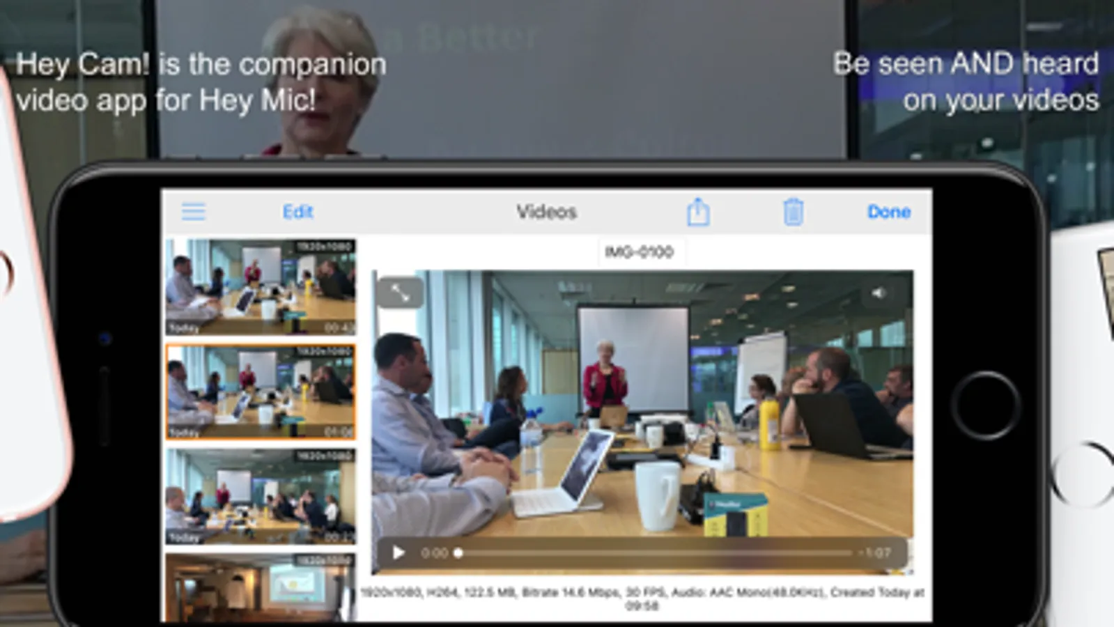 Hey Cam! is the companion video recording app for the revolutionary Bluetooth lapel microphone, Hey Mic! (www.loveheymic.com). Hey Mic! is for speakers, trainers, video bloggers, teachers, marketing and sales professionals...everyone that wants to get great audio with their iPhone and iPad videos. It's ideal for recording presentations & testimonials, perfecting pitches, capturing blogs and more.