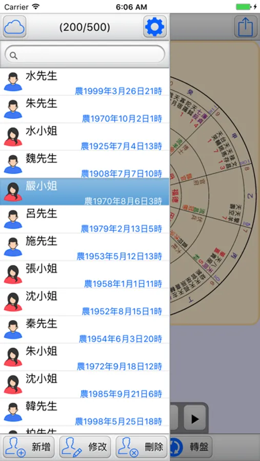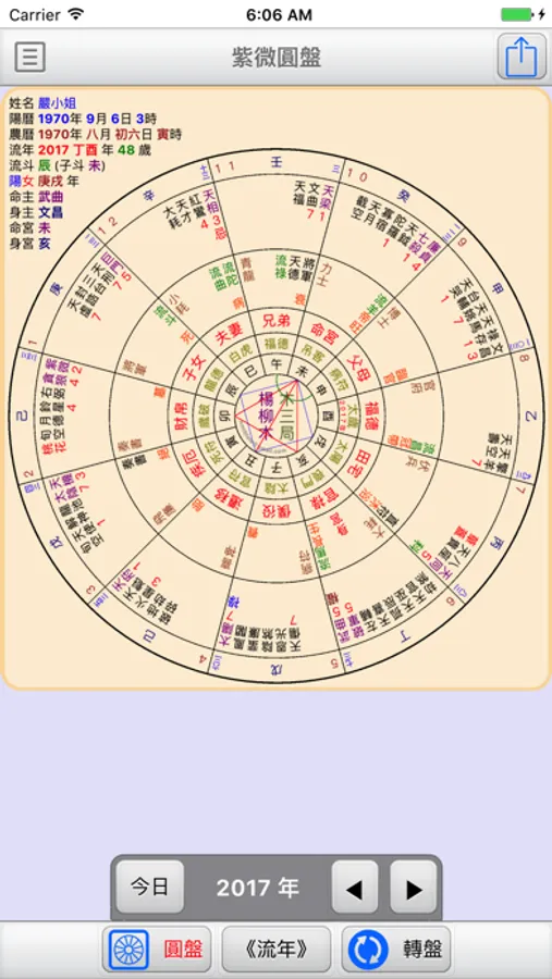 ●圓盤:包含紫微圓盤、姓名、出生日期陽曆及農曆、流年、命身主、命身宮...等,提供雙指縮放大小、按住恢復大小。