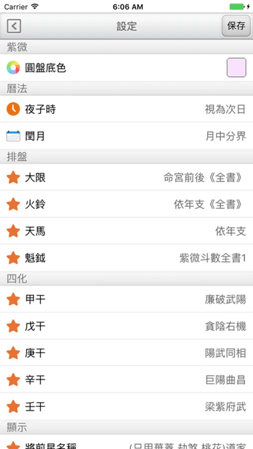 ●排盤:提供大限、火鈴、天馬、魁鉞、四化等設定。
