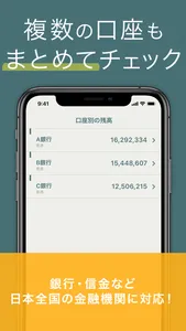 登録した口座情報から、合計残高や残高推移をかんたんに確認できます。もちろん、口座別に残高や明細を確認することも可能です。