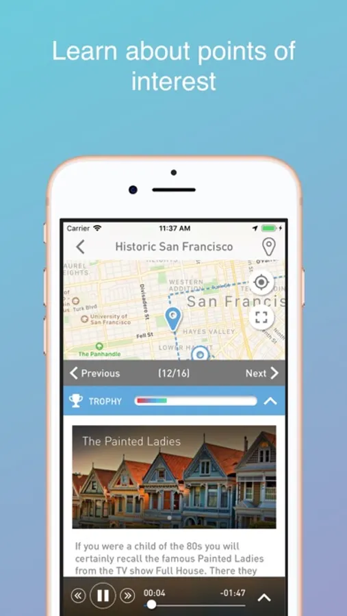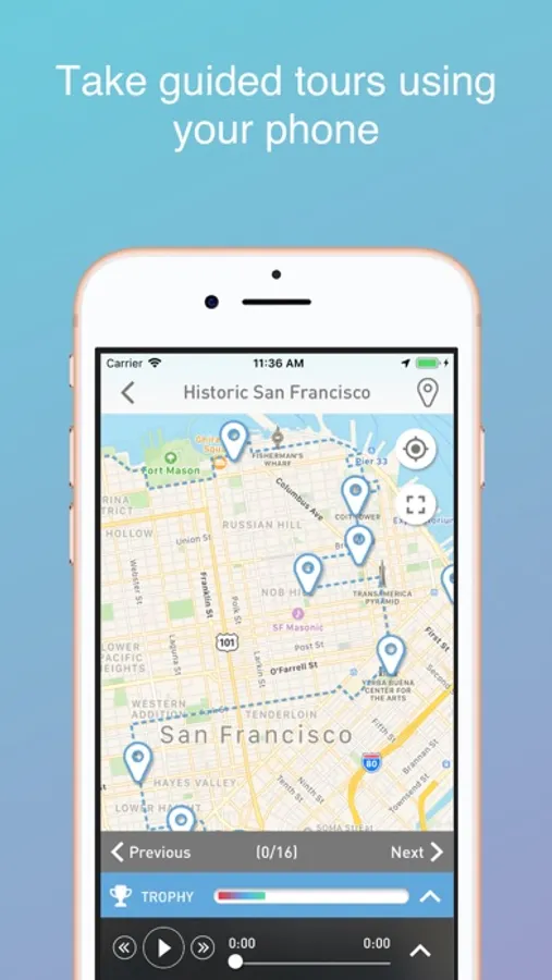 Once you arrive at a location, the narrator will automatically begin speaking. You can keep the device in your pocket if you just want to listen to the audio, and take it out when you want to view photos and follow the route. Or, you may manually prompt locations by selecting them from the list view, or on the map. Whether you're a traveler wanting convenient and quality digital experiences, or at home, Junket will be your guide!