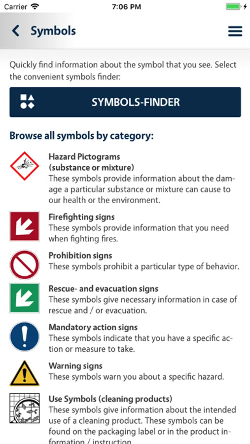 Using the app, the meaning of a symbol can be traced. By answering three questions about form, color and the type of image the app automatically searches the symbols that comply with these characteristics (eg bans, commandments, warning and hazardous properties of substances and mixtures). By selecting the corresponding symbol a brief explanation of the meaning is shown.