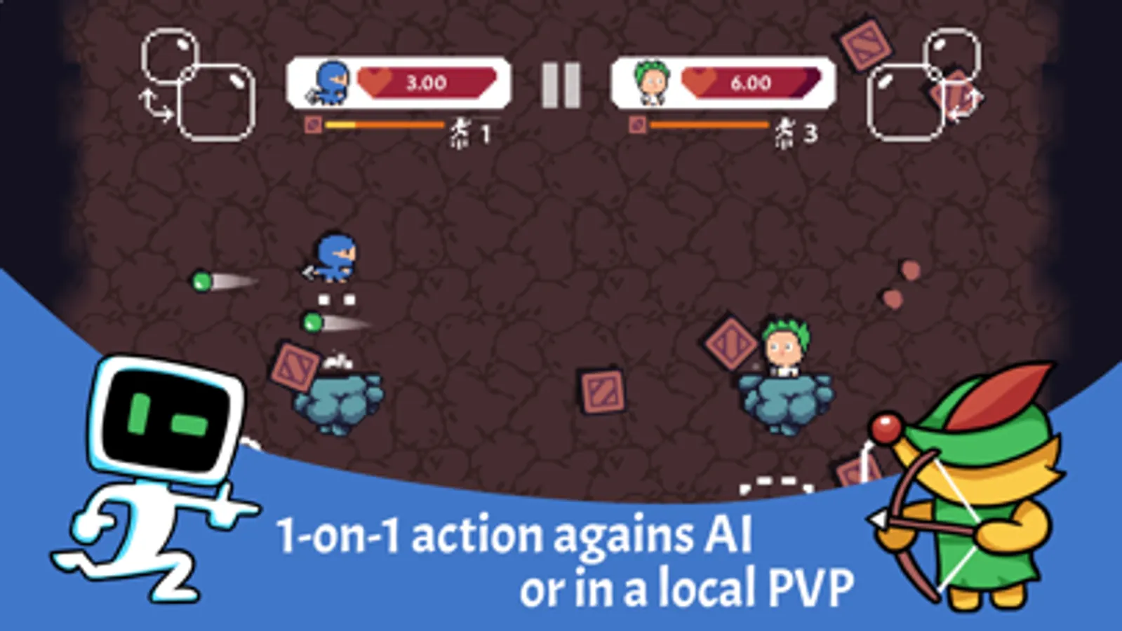 ANYCRATE is the 1v1 arcade action game for 1 or 2 players to play alone against AI or together with a friend in a local PVP!