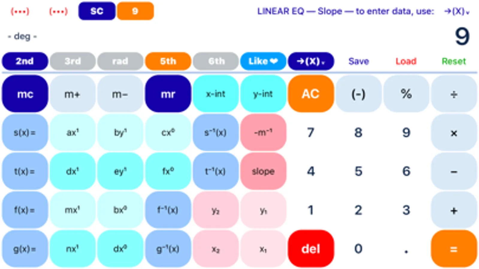 • 9 – LINEAR EQ — Slope — to enter data, use: →(X)v