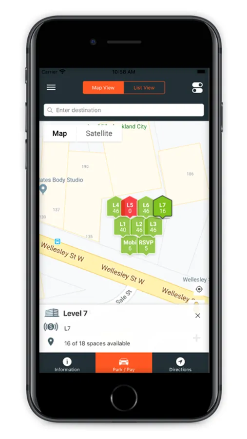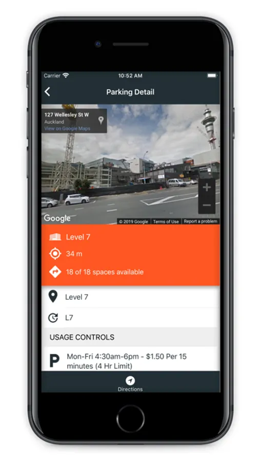 Each parking area marker on the map displays a colour and the number of available parking spaces. Simply tapping a map marker will reveal details of the parking spaces in that particular area. This will show you details about the parking spaces such as the hours of operation, tariffs, and other features.