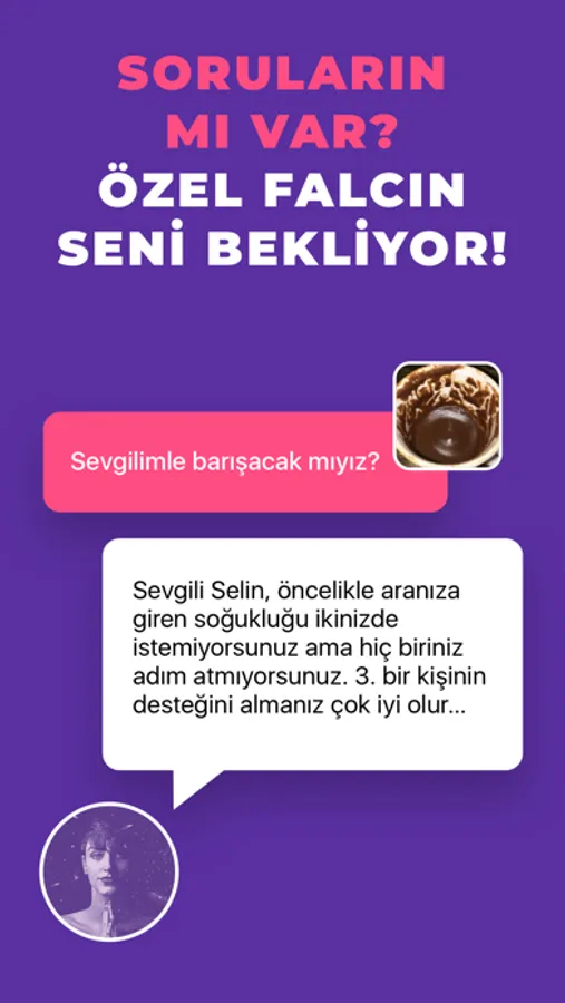 Uygulamayı indirdikten sonra üye olmadan kahve fincanı fotoğrafını çekip 30 saniye içerisinde uzman falcılarımıza gönderebilirsin. 10 dakika sonra uzman falcılar tarafından yorumlanan kahve falını okuyabilirsin.