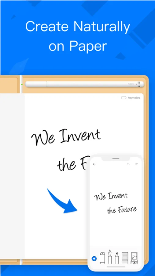 Write or sketch on regular paper and captured digitally which can be projected onto a screen in real time and facilitate meetings, online education, drawings, etc. When not paired, all work is saved internally to RoWrite for further editing and sharing.