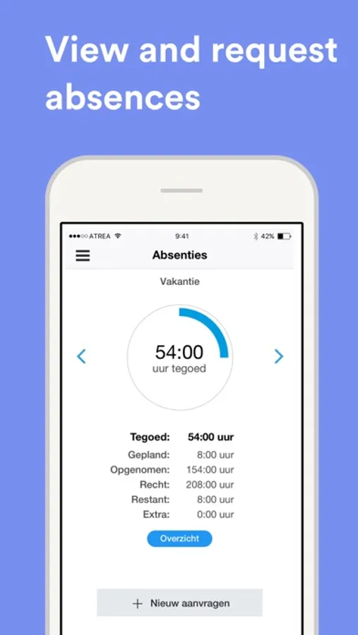 Quickly make an absence request by tapping the desired period and absence type. Have a quick overview of all your past absence requests with status.