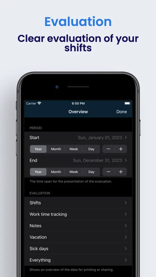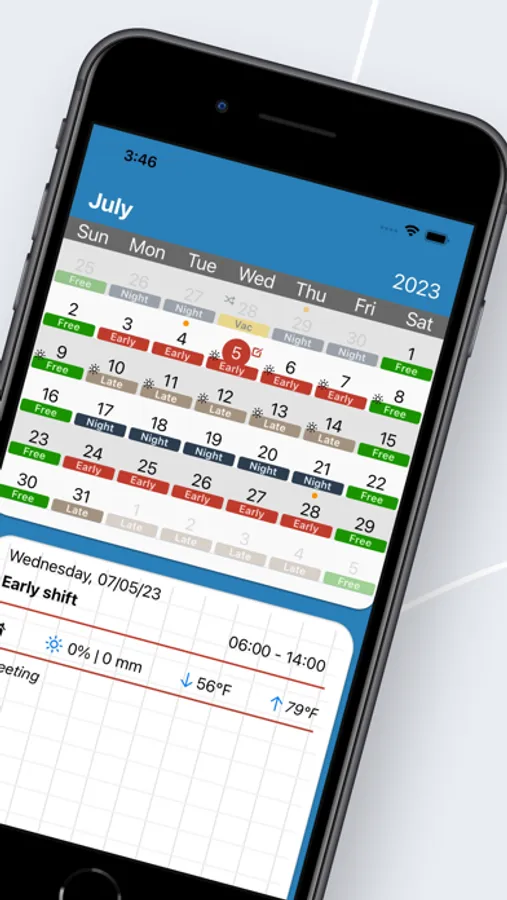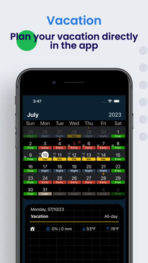 Switch to dark mode for relaxed work in low-light conditions and get weather forecasts for your planned shifts (iOS 16+).