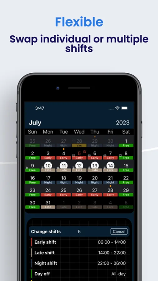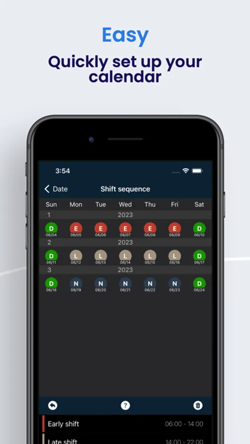 With our Shift Calendar app, you'll conquer shift work like a pro! You can whip up your perfect work schedule in no time, organize your shifts, and plan your workday like a boss. Check out what our Shift Work app has in store for you: