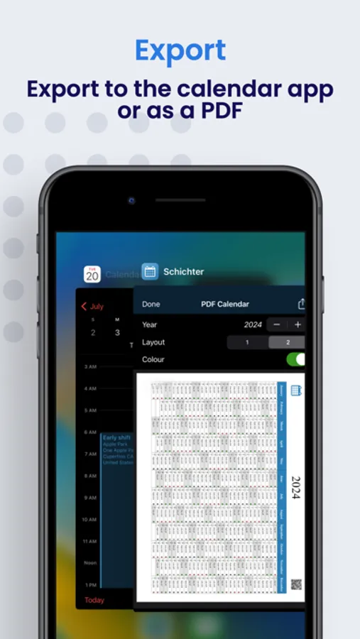 Export your shift schedules to the iOS calendar or as a user-friendly PDF annual calendar.