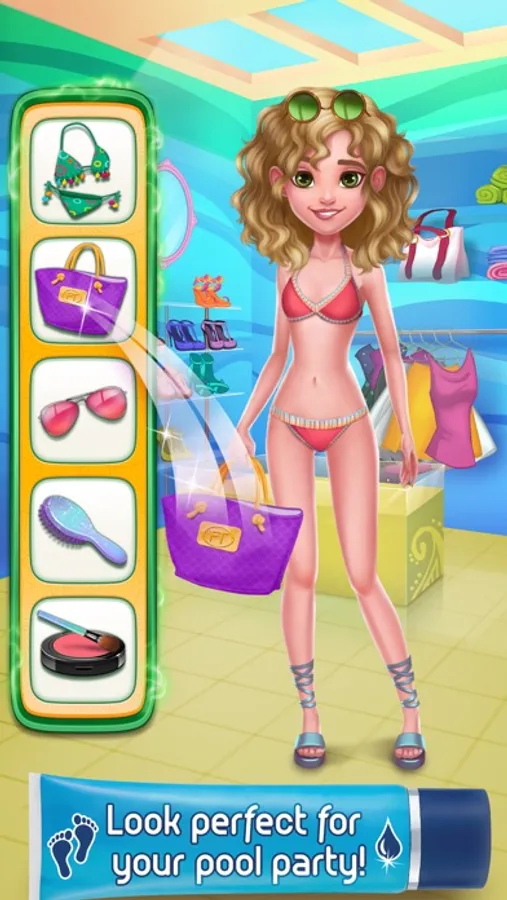 > Dress up in a pretty bathing suit for the pool party! Accessorize with an adorable beach bag and rockin’ sunglasses, and complete your pool party look with cute shoes!