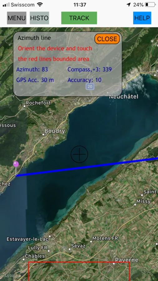 - The distance and the azimuth are displayed