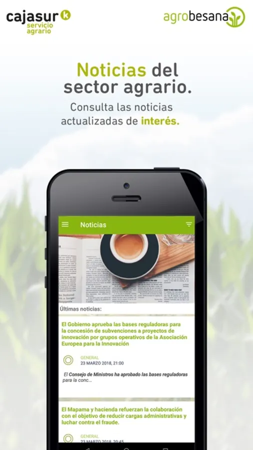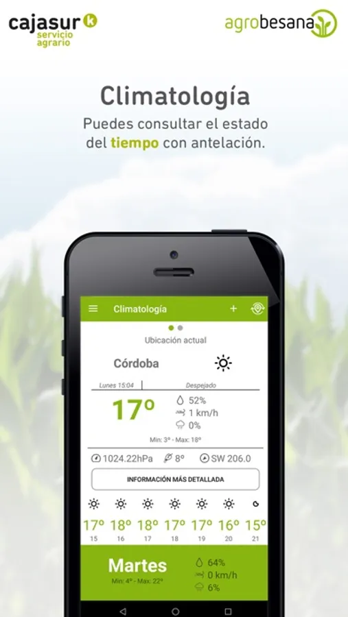 Con Agrobesana, entre otras cosas, puedes consultar la meteorología geolocalizada de los próximos días, estar al tanto de las últimas noticias del sector o tener en un solo clic la información de los precios mínimos y máximos de los mercados de tu interés.